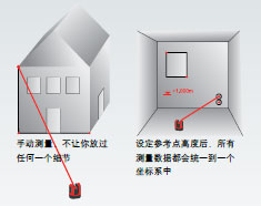 高度标定 测量任何一个点到选定的参考点之间的高差且标示该点的高度值。典型的例子就是用于标定门、窗、天花板等的标高和高程的传递。 | ![]() | |